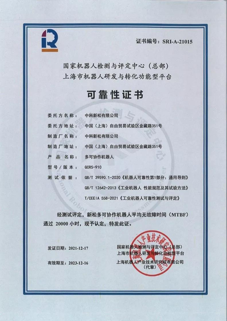 中科新松多可®协作机器人通过MTBF 20000小时测评